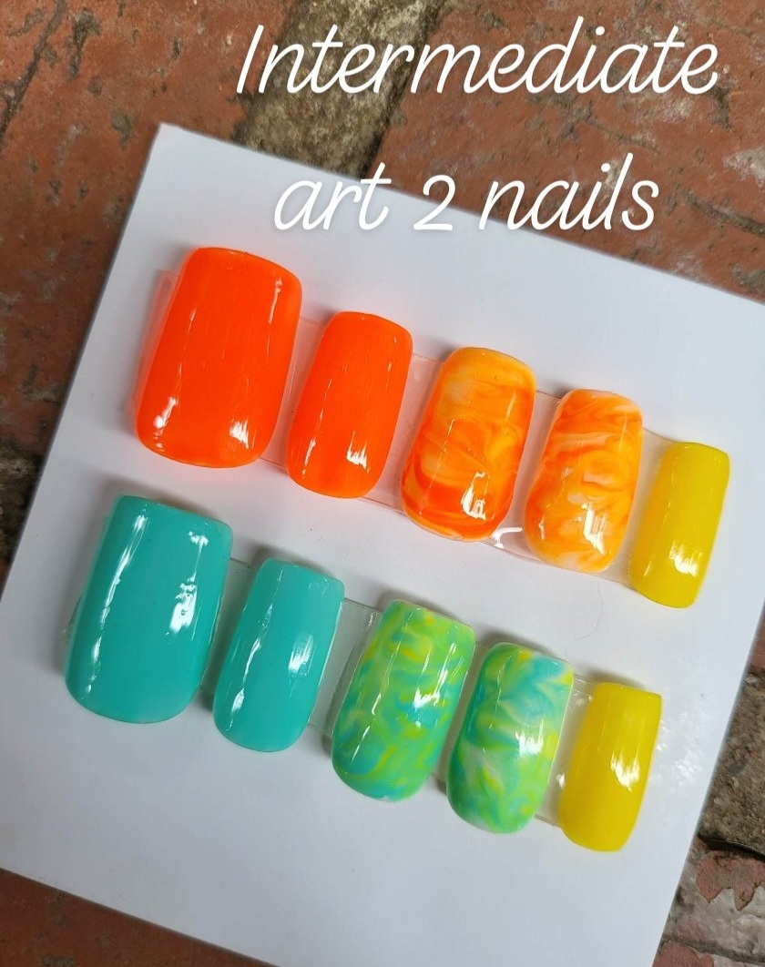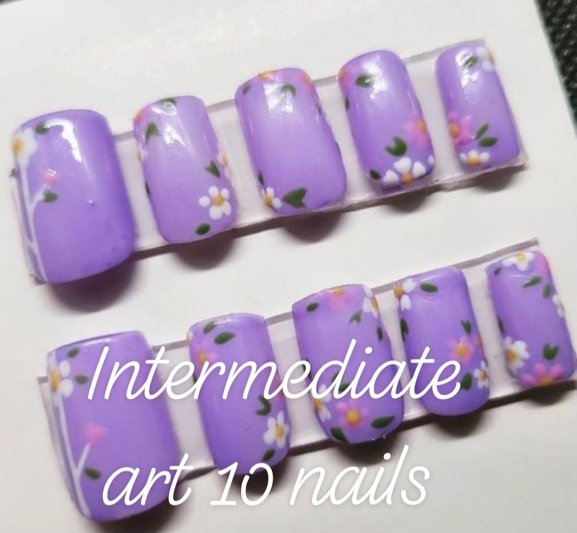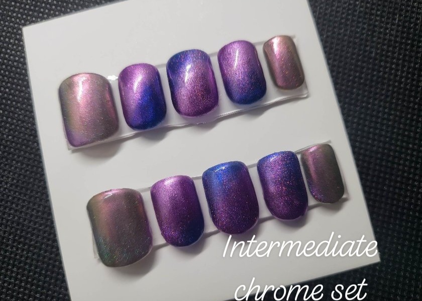 Custom press on nail set with 20 nails total. Intermediate designs include French tip, swirls, flowers, magnetic polish, chrome, stars, etc. Base rate shown, select how many fingers you would like a design on to see total price. Once you purchase you will be emailed the sizing steps and can pick shape and length so they are the perfect set for you