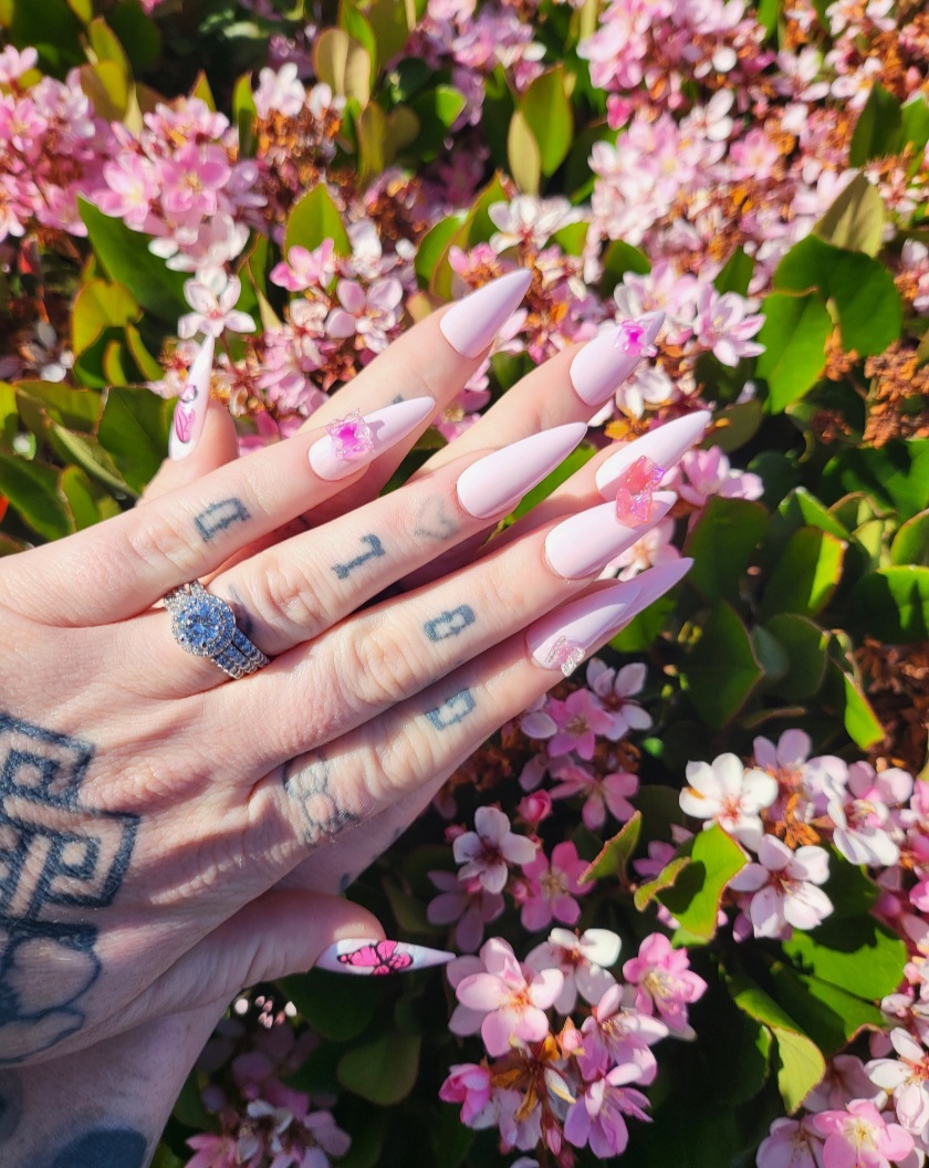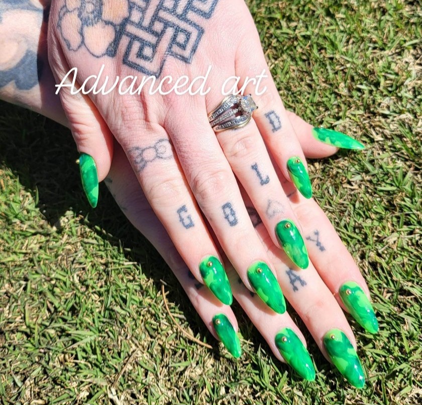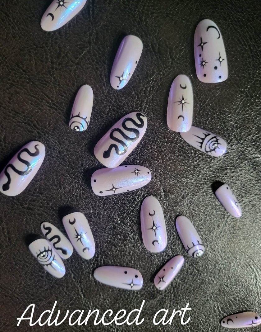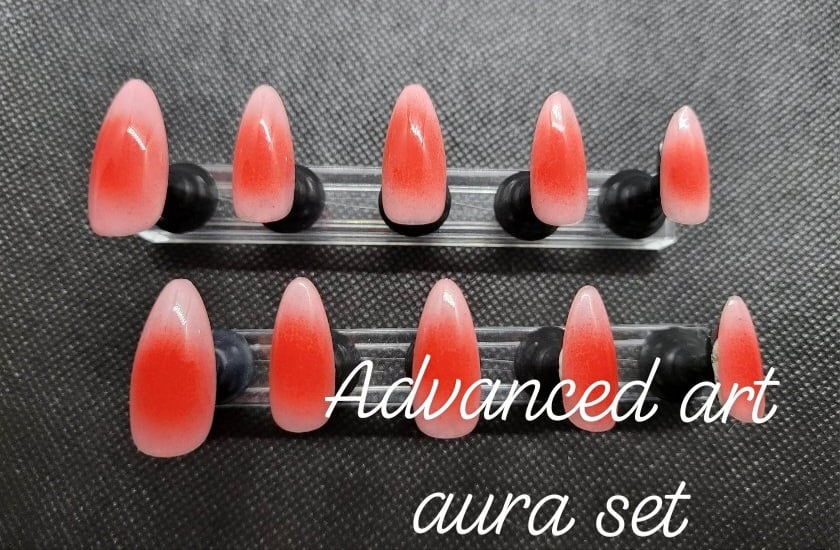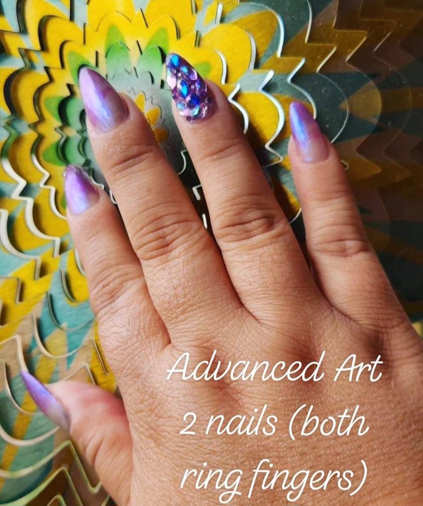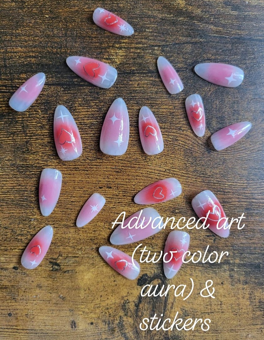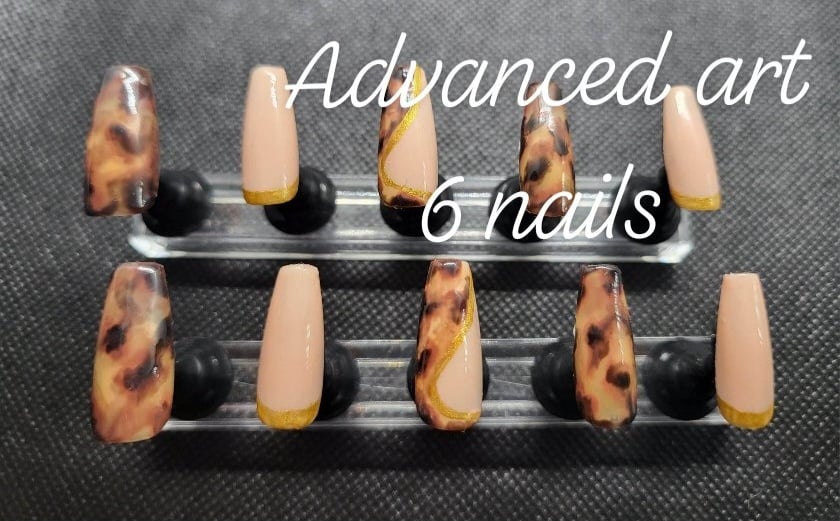 Custom press on nail set with 20 nails total. Advanced designs include tortoise shell, crystal/gem art, 1-2 color aura/airbrush, animal print, flames, checkerboard, etc. Base rate shown, select how many fingers you would like a design on to see total price. Once you purchase you will be emailed the sizing steps and can pick shape and length so they are the perfect set for you