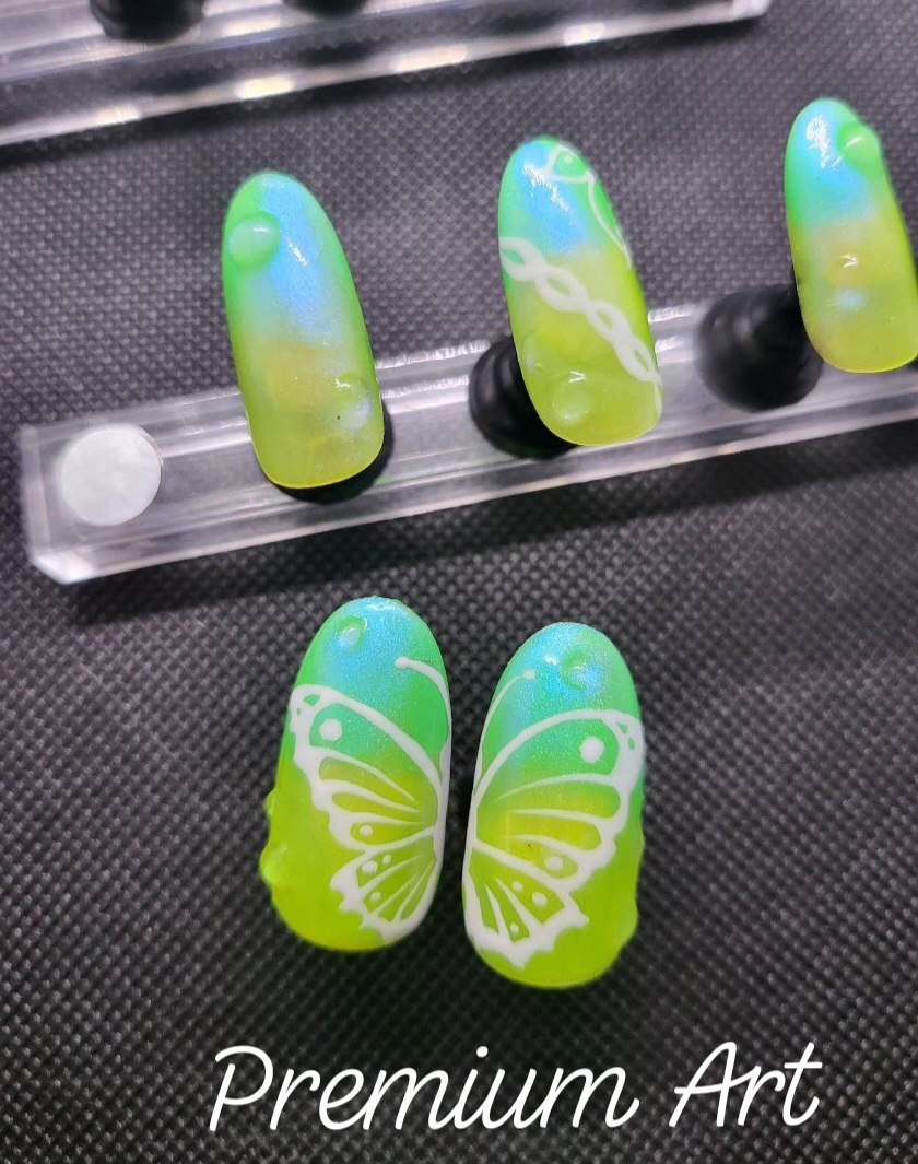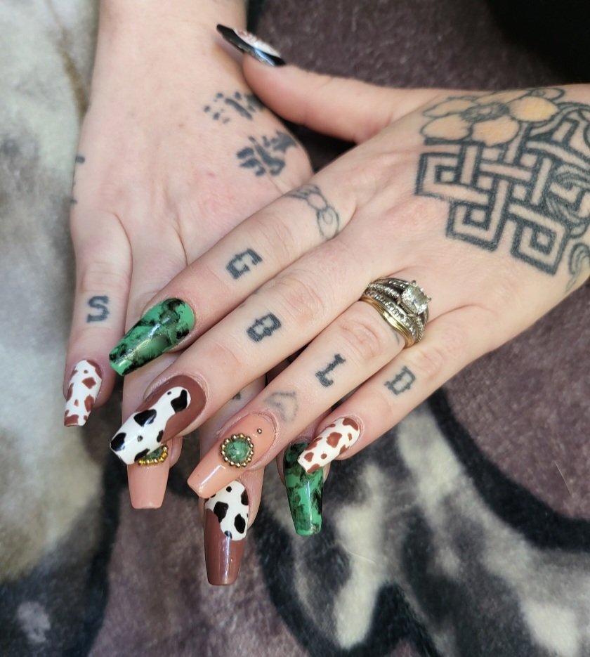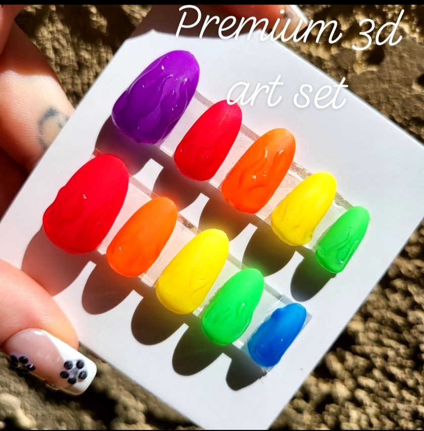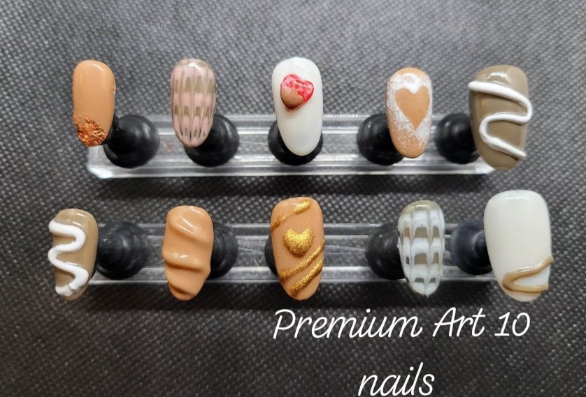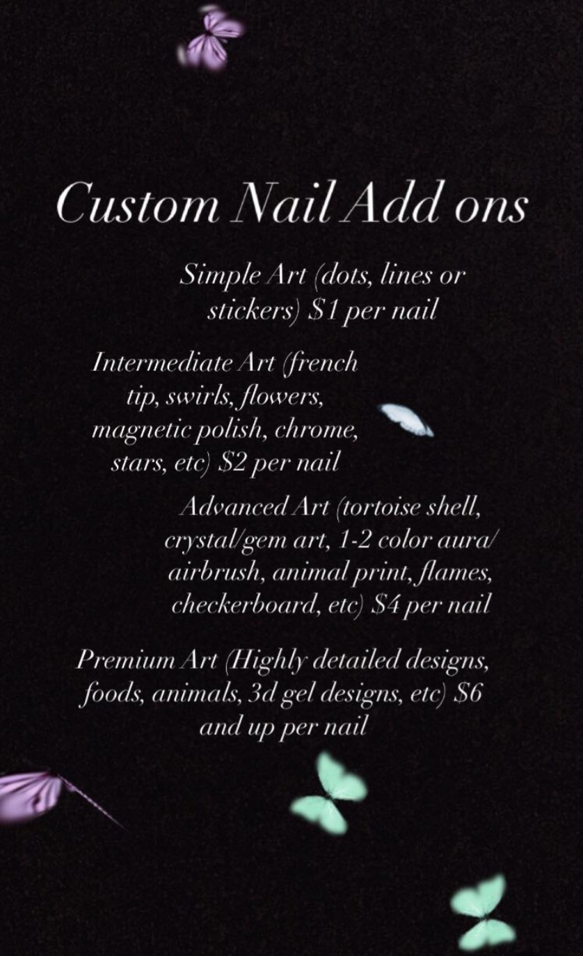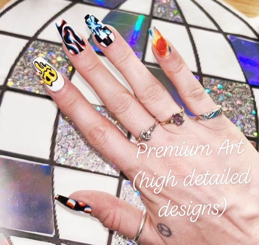 Custom press on nail set with 20 nails total. Premium designs include high detail artwork, foods, animals, 3d gel designs, etc. Base rate shown, select how many fingers you would like a design on to see total price. Once you purchase you will be emailed the sizing steps and can pick shape and length so they are the perfect set for you