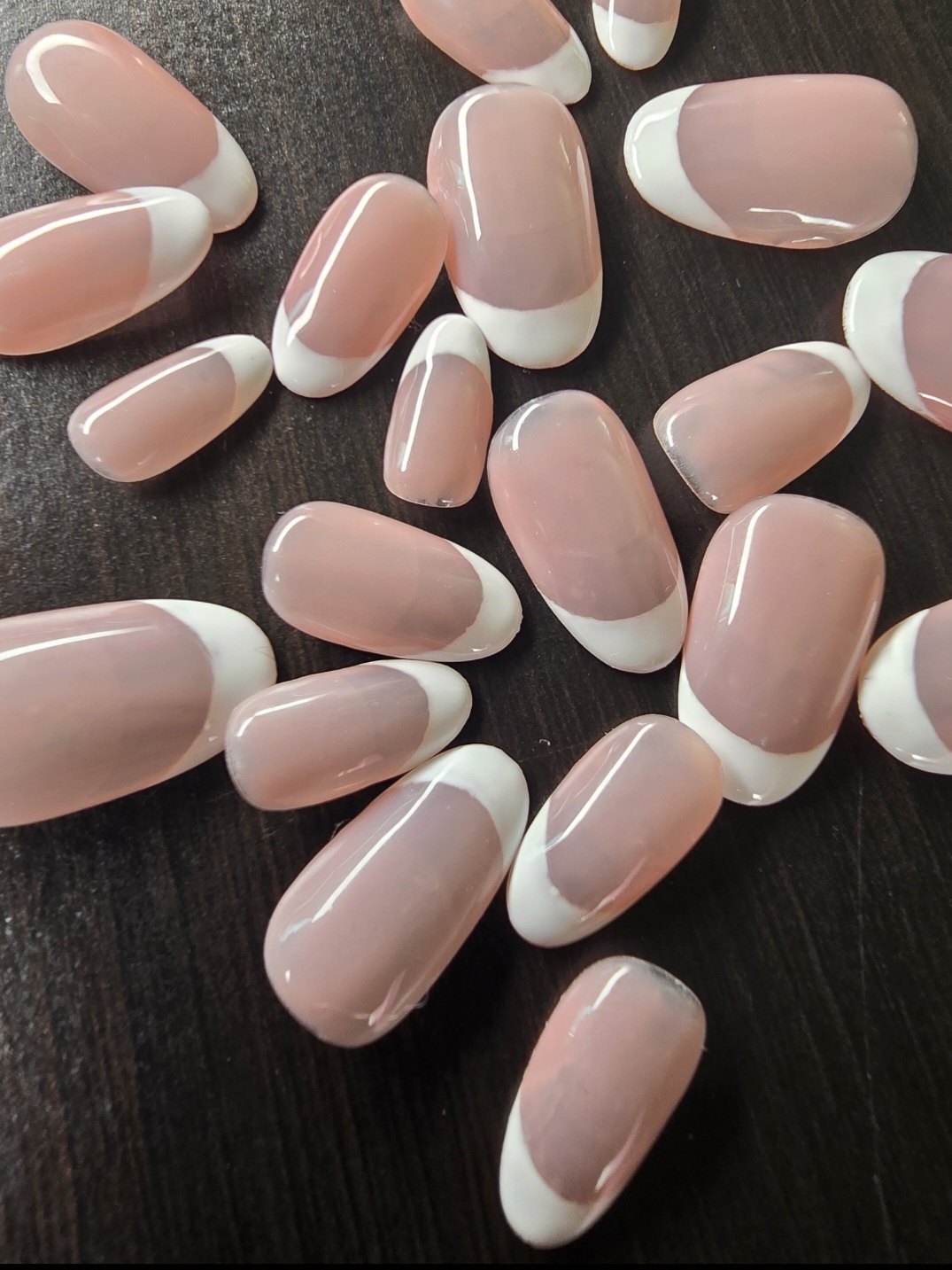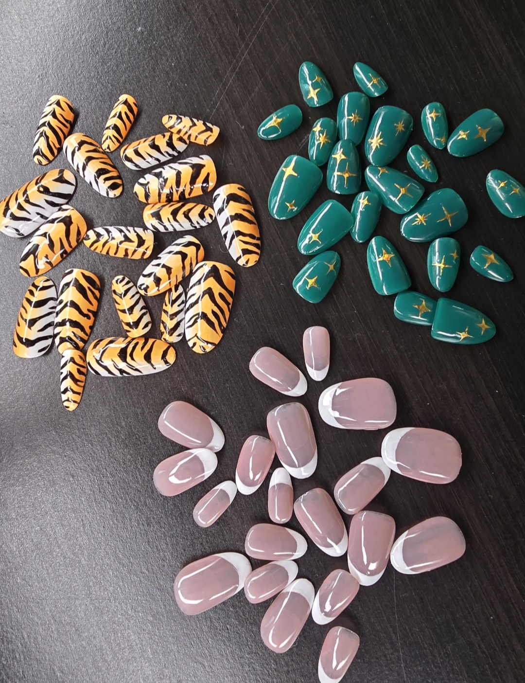Three sets of press on nail sets. Short almond/oval, medium length oval and long oval nails. Two nails in each size