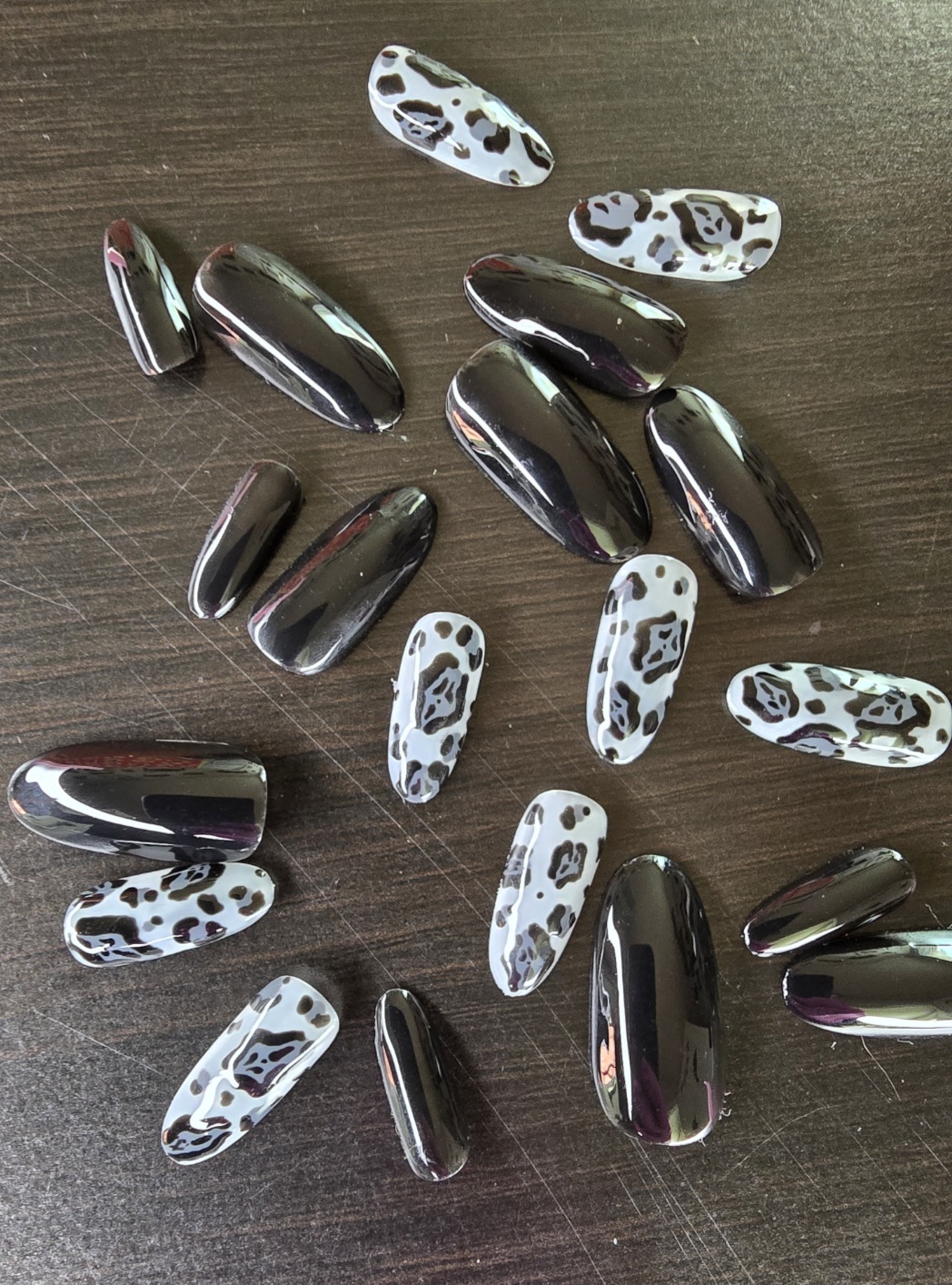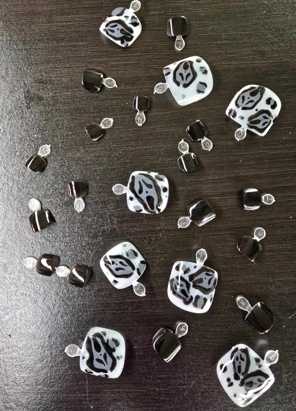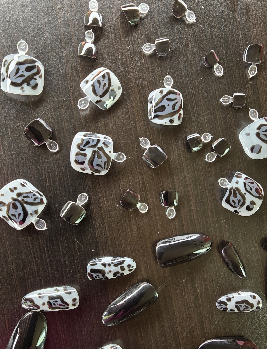 Press on nails and toenails, all hand painted. 20 finger nails sizes 0-9, 24 toenails sizes 0-11. Size guides available